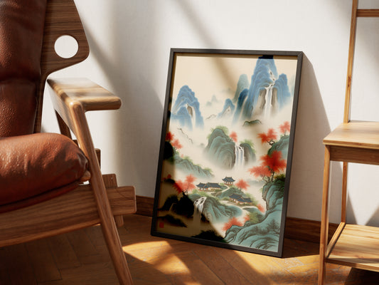 Asian Mountain Landscape with Waterfalls and Mist - Traditional Art Digital Download Printable Wall Art